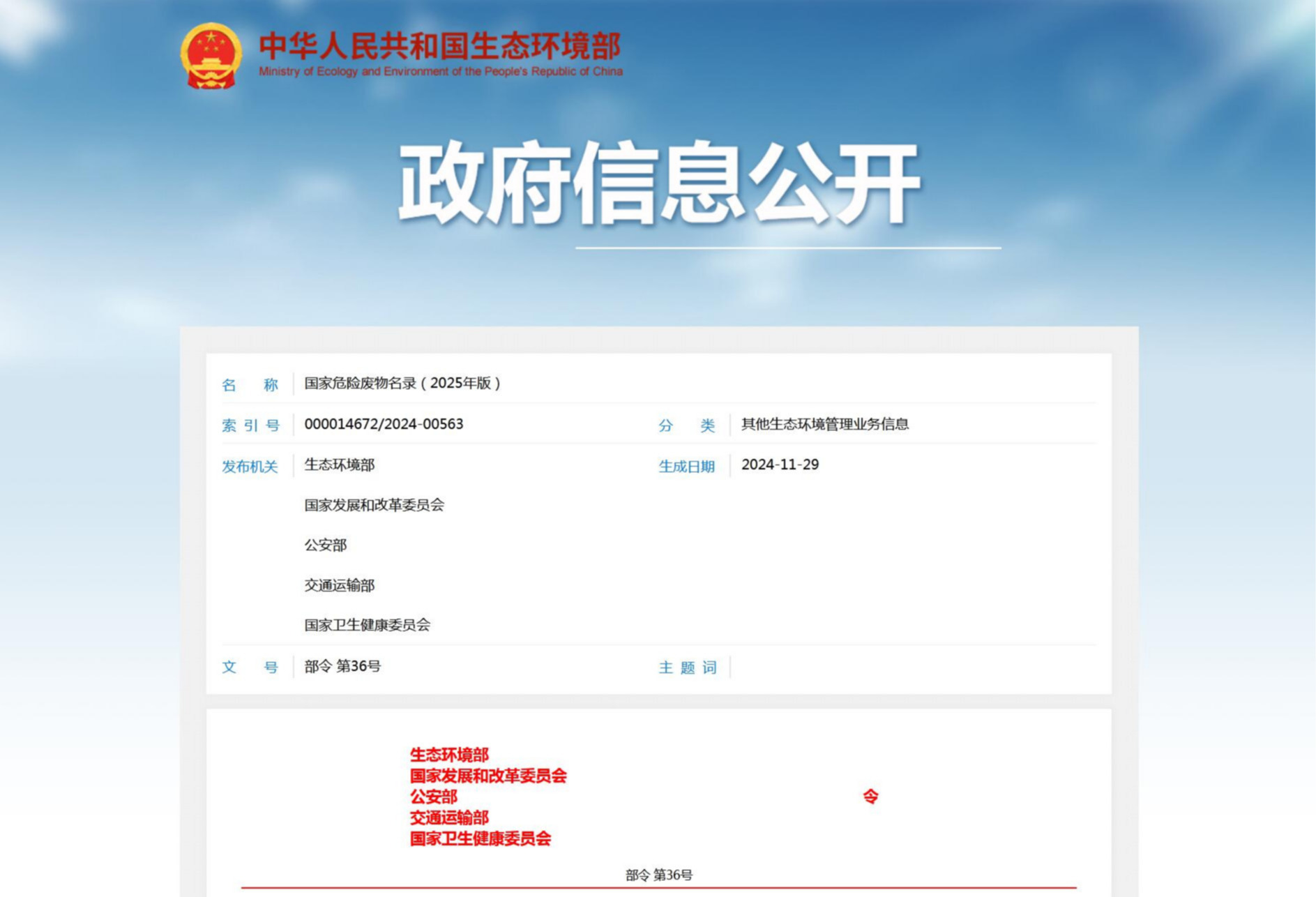 《国家危险废物名录(2025年版)》已于2024年11月8日由生态环境部2024年第5次部务会议审议通过,并经国家发展改革委、公安部、交通运输部、国家卫生健康委同意,现予公布,自2025年1月1日起施行。